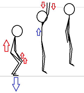 Cartoon illustration of a jump without the use of arms on left, and with the use of arms on right. If the arms are accelerated upwards during the takeoff, an extra force is exerted on the ground, and this is added to the jump by accelerating the arms downwards once in the air. Red arrows indicate acceleration direction and blue arrows indicate the counterforce due to acceleration.