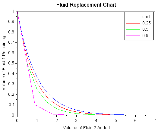 Comparison of the volumetric efficacy of replacing an initial volume of Fluid 1 with Fluid 2. The blue line represents a continuous flow of Fluid 2 into the chamber, while the other lines represent periodic removal of some volume fraction of the chamber (vacuum pump or dumping out liquid) and refill with Fluid 2.