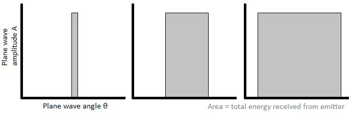 This image illustrates the light received from three objects, which will appear equally bright. On the left, an emitter that appears small (a distant streetlight) delivers less total energy to the detector, but at a narrow range of angles. On the right, an emitter that appears large (a nearby streetlight) delivers more total energy to the detector, but over a broad range of angles. Dividing total energy by angle range leads to a constant brightness for all these objects. If an aperture, such as a piece of black paper with a hole in it, is used to limit the observed angular range of (and total energy received from) the nearby emitter, the part of the emitter that remains visible will look just as bright as it did before. Moving further from the emitter reduces the range of angles that reach the detector, but does not reduce the amplitude of plane waves in this mathematical representation, so brightness is again unchanged.