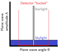 Shown is a schematic comparison of optical brightness from a bright star (gray) and dim background skylight (blue), incident on a detector "bucket" (red) that captures all energy over some range of angles defined by the optical hardware. As the detector intrinsically carries out an integration over its acceptance angle range, the total energy from the skylight overwhelms the total energy from the star, even though the latter is much brighter (more concentrated).