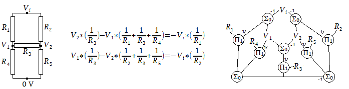 The voltage in a 5-resistor network, electrical schematic on the left, is solved by a system of two linear equations. These equations are indicated in the center (determined by applying charge conservation at V1,V2), along with the structural expression on the right. The structural expression clarifies the integrated nature of the two equations because the entire structure is connected, and also presents a solution path for any of the resistance values.