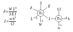For an end-loaded cantilevered beam, the deflection δ at the end is proportional to the load W and to the length cubed L^3, inversely proportional to the material's modulus E. It is also inversely proportional to the cross-section moment of inertia I, which for a rectangular beam of width w and height h is given by w*h^3/12. We may represent the two equations as two Π1 nodes with weighted connections. This is illustrated below.