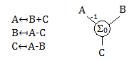 A comparison of the traditional equation and structural expression syntax. On left, there are three ways to write the equation A=B+C, solved for each vertex, and none of these equations make explicit the underlying symmetry. On right, the structural expression signifying a Σ0 node where all the attached vertices sum to zero; this expression remains the same regardless of what to solve for. Note the -1 on the connection to A, signifying this value is multiplied by -1 when evaluating the sum.