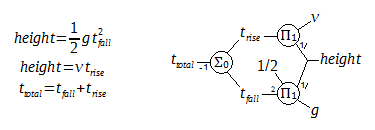 The equations and structural expression for the time of sound after a fall, with gravitational acceleration g and speed of sound v. Note the small numbers on various connections signifying an exponentiation on the product or negation on the sum nodes. Compare the loop shape of the quadratic equation to the loop seen earlier with the 2-variable linear system - the diagram makes it clear that the quadratic equation, although written as one equation, cannot be solved directly.