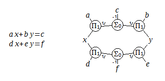 A structural expression for a linear system in two variables (x,y) and six coefficients, with equations typed on the left. Interestingly, when drawn this way, two equations turn into a single loop.