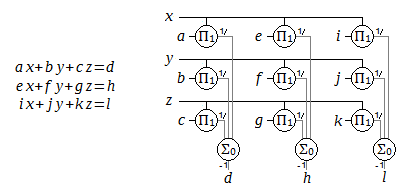 Equations and structural expression for a linear system in three variables (x,y,z) and twelve coefficients. The diagram has been drawn in a matrix form, but may also be visualized in 3D space with the sum nodes extending out of the page.