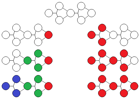 Second, the unknown regions are to be represented in terms of one defining vertex per unknown region. In a system of equations, these are the (say) x,y,z variables that appear in each equation, however in the structural expression we do not know ahead of time which vertices should be considered as defining vertices (since their values may be either known or unknown). We pick an unknown vertex at random, and then check which nodes may be solved assuming this vertex is known. The resulting solved vertices have a value directly derived from the first unknown vertex, and are thus part of the unknown region defined by that vertex. We continue this process, adding vertices to the unknown region, until reaching nodes that cannot be solved: these nodes will either have multiple unknown regions incident, or will have one unknown region multiply incident. Therefore these nodes are added to a list of boundary nodes in the solution region. Next we pick another unknown vertex, and nucleate another unknown region defined by it. This is continued until all unknown vertices are in an unknown region.