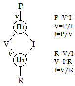 A structural expression for electrical voltage, current, power, and resistance, with six assignment-form equations that it encompasses directly. There are two Π1 nodes where all the attached vertices multiply to one; this expression remains the same regardless of what to solve for. Note the 1/ on the connections, signifying this value is inverted when evaluating the product.