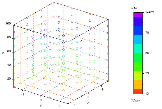 The image plane is located at Di=-1 and the object points are arranged on a square grid at (x,y)={-1.5, -0.5, 0.5, 1.5} and z={10...100}. The object points are then projected onto the image plane through (0,0,0). The nearer (to the image plane) object points are colored red, while the more distant object points are colored violet, with rainbow colors in between. The code can also simulate angular shifts, but these shifts caused no appreciable difference in the phenomenon, so the scenario presented below is looking straight towards the virtual source.