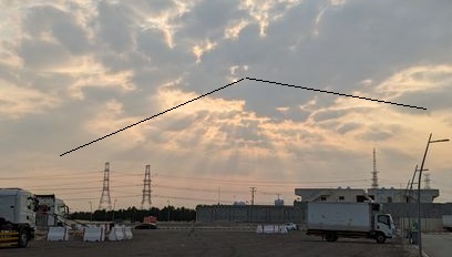 A photograph showing apparent rays emanating from the location of the sun, which is hidden behind clouds. Black lines have been added to aid in identifying the convergence point. The camera does not fully capture the subtle nature of the effect.