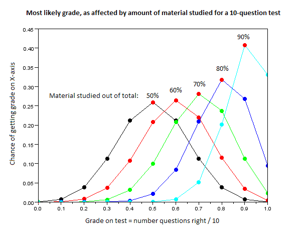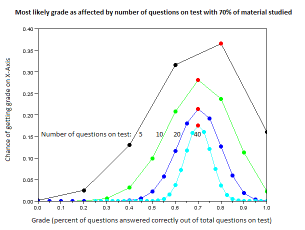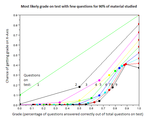 This represents the grade distribution for 90% of material studied on tests with few questions (less than ten). In all of them except 9, the most likely grade is 100% - higher than amount studied, simply due to the quantized nature of the grading. The chances of receiving a lower grade than 90% are also fairly high, about 40% for a test with 7 to 9 questions (this is balanced out by the fact that the grade is close to 90% - yet it is still not the most valuable as an accurate indicator, and certainly the difference between A and B can be felt by the student). In fact, with 9 questions the student who studied at an A level (90%) is most likely to get a B (88.9%)! My advice for teachers is to use at least ten questions, then this issue does not arise (since 1 question lost on 10-question test is 9/10=90% while 8/9=88.9%). Again, not much difference mathematically but in terms of self esteem would you rather get a low A or a high B?