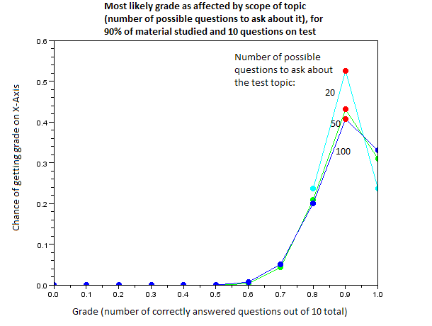 In this graph, each test contains 10 questions and 90% of material has been studied; however the constant describing the breadth of the course (the amount of unique questions that can be asked) is changed from 20 to 100. With an increasing number of questions, the test becomes less likely to accurately indicate the amount of material studied. Particularly, the chance of attaining a higher grade becomes more attainable, as does the probability of getting a much lower grade. The chance of getting a representative grade meanwhile decreases.In realistic terms this is due to luck in the types of questions that appear on the test taking over the effects of the test-taker's knowledge of full subject matter, since full knowledge is impractical for a very broad topic.Thus it is better to give brief and focused tests than wide-spanning and general tests if one is seeking how much the test taker has actually studied.