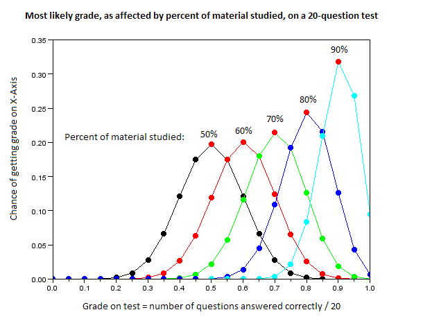 Here it is evident that studying more material increases the probability of attaining a grade representative of the amount of material studied. Note that the chance of obtaining a grade of 100% increases non-linearly with increasing amount of material studied (one is more than three times as likely to get 100% after studying 90% of material than after studying 80%)
