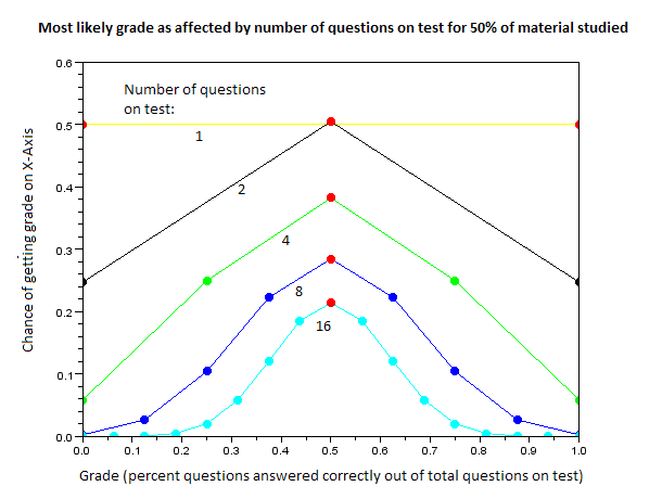 It may seem that if the test only covers a small (<10%) portion of the material learned during the course it may be practical to get away with studying only 50% of material. This graph shows that this is clearly not the case, as even with two questions the most likely grade is a 50% and it gets only more likely with increasing questions.