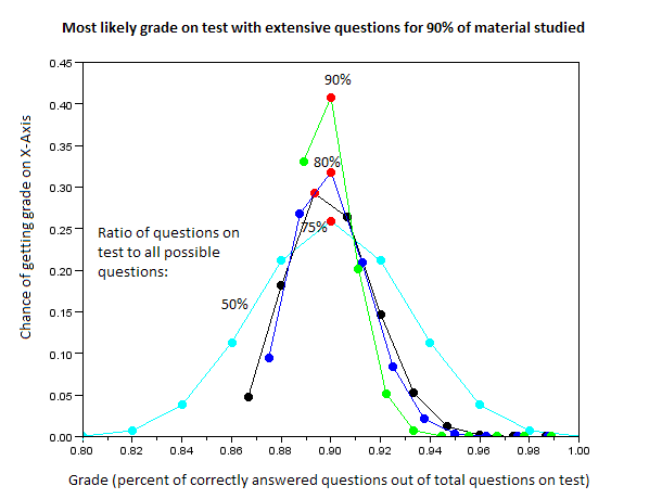 This represents the grade distribution for 90% of material studied on a test with extensive questions, covering a significant percentage of all material studied in the course (50% and more). As is evident, the grades are much more representative of actual effort (the X-axis starts at 80%, unlike above graph starting at 0%). It is still possible to get a grade of less than 90% if an odd number of questions is used on the test (represented by 75% test size case). With increasing test length, grades much lower than studied for are mathematically unattainable, while those much higher are realistically unattainable (this is inverted when very little material is studied), thus a longer test is a better indicator of amount of content learned.