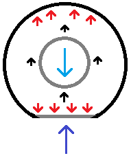 Having considered the ground interface, we need to see how the force is transmitted from the tire to the rim, or at the tire-rim interface. For this, we will start the consideration with a tire having an inner tube. An inner tube may be assumed to provide a way of having different forces on different areas of the rim. Thus perhaps the inner tube moves around the rim such that the contact area of the rim at the bottom is higher than that at the top. Otherwise, since pressure at the top and bottom are the same (pressure is a uniform property, and there are no divisions within the tire) there should be no net force on the rim.