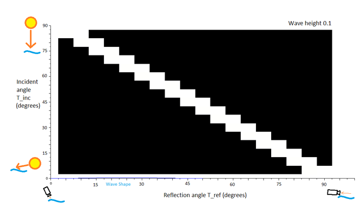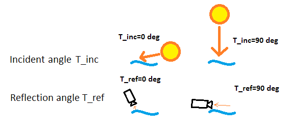 The incident angle, T_inc, is a constant describing the sun's angle in the sky, which here can range from just above 0 (close to the horizon) to 90 (directly overhead) degrees. The observed reflection angle T_ref similarly ranges from just above 0 (near the horizon, far from observer) to 90 (close to and under observer) degrees.