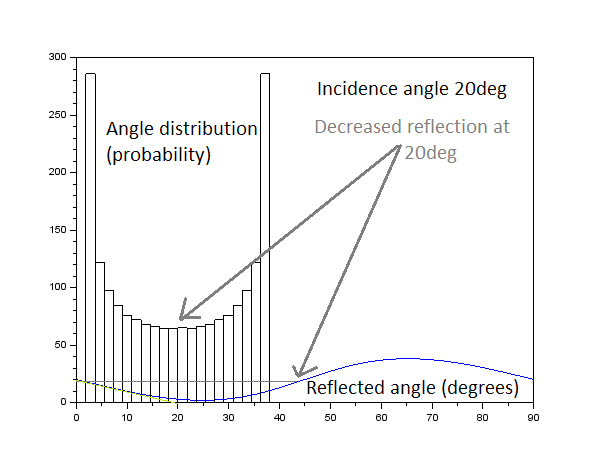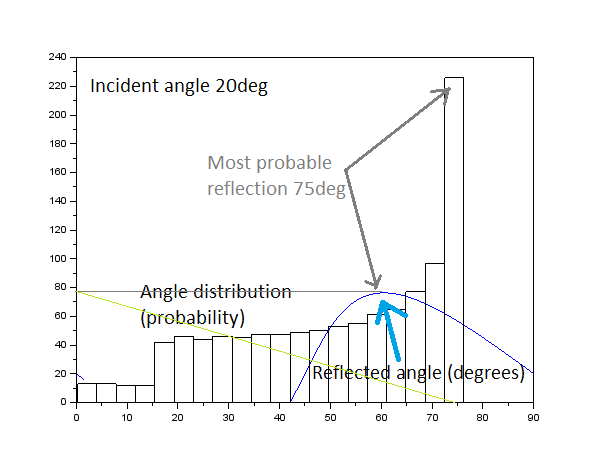 The reflected angle distribution for a lower-amplitude wave is clustered around the incident angle, but peaks at the extremities (due to higher probability of the wave surface reflecting at a tilt as opposed to as a perpendicular surface). Note that axes have different meanings for the curve and the histogram, for the former the y-axis is degrees and x-axis is wave position, while for the latter the x-axis is degrees and y-axis is frequency.