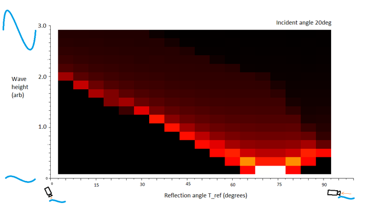 The wave height-reflection plot for 20deg incident angle. The sun is most visible at low wave height and blurs and becomes dimmer as waves increase.
