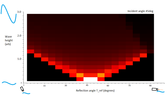 The wave height-reflection plot for 45deg incident angle. The features are similar to the 20deg plot. The sun is seen to become much dimmer as wave height increases, but in exchange it becomes visible over a wider range of angles.