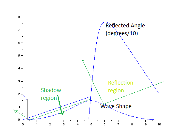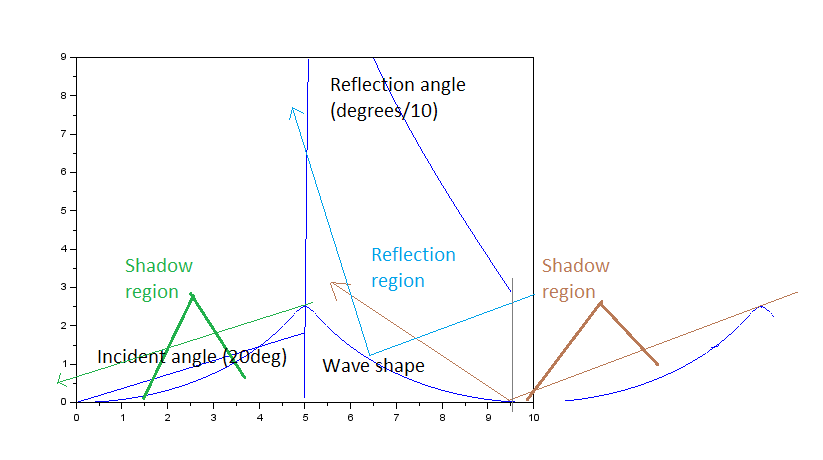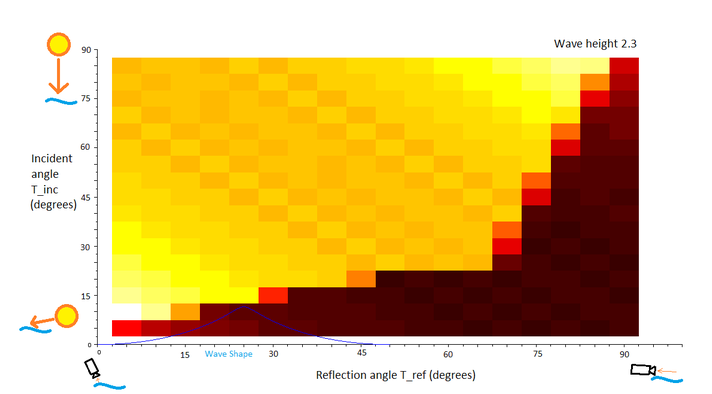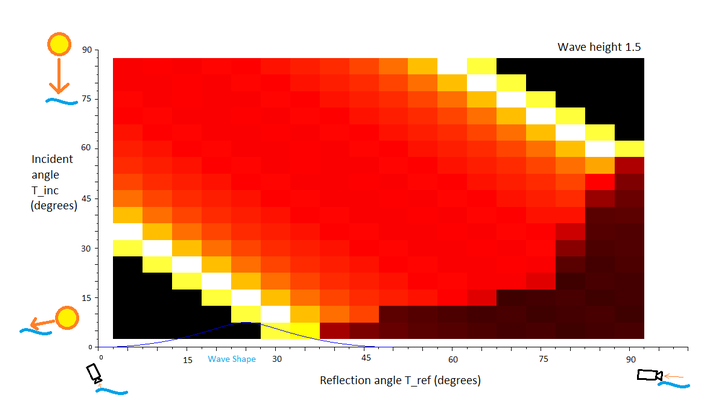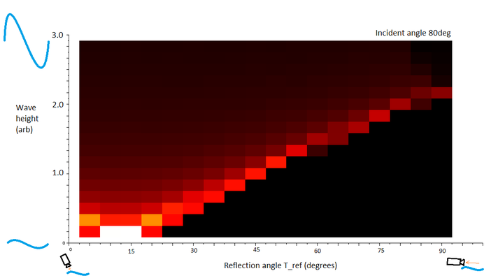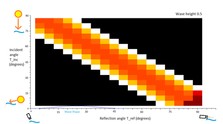 As the wave amplitude increases though, the simple model is not adequate. First, it should be expected that if a peak is well above the rest of the wave, it will prevent light from reaching parts of the wave (or create a shadow on the wave). This is accounted for by removing all calculated reflections which fall within this range: