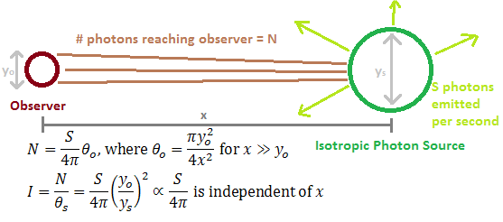 Take a light-emitting source of diameter y_s, that emits S photons per second in 4pi steradians (meaning the object emits photons in all directions equally). Then take an observer with light collection aperture of diameter y_o. The observer and source are separated by a distance x. The number of photons that reach the observer can be approximated as S/(4pi)*T_o where T_o is the apparent angle of the observer's light collection area as seen from the source. We find T_o = pi*y_o^2/(4*x^2) for x>>y_o. The apparent angle from which these photons originate from the observer's view is T_s, which is similarly T_s = pi*y_s^2/(4*x^2) for x>>y_s (this is allowed if we split a finite source into a collection of point sources, as done for this analysis). Then the ratio, photons reaching the observer over the observed angle, is independent of distance due to both T_o and T_s depending on x in the same manner: I = S/(4*pi)*(y_o/y_s)^2, where we define the ratio as the 'intensity' I. Taking the limit of this to point objects we find I = S/(4*pi) - in this case we can interpret any finite object as a series of point objects, with the y_o and y_s parameters introduced to find a solid angle only. This means the apparent brightness of an object as seen by the eye or by a camera is only dependent on the object's actual light-emitting characteristic (S). This is one reason stars can be seen at night, despite the great distance to them.