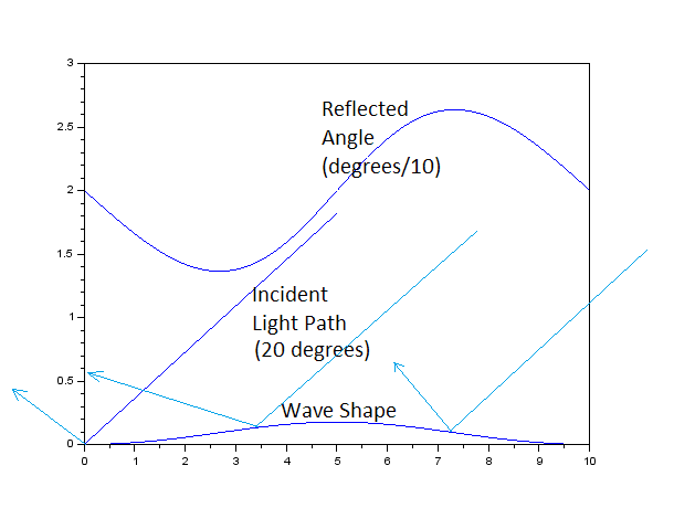 A low amplitude wave shape from the previous plot is shown on the bottom of this figure. On it are incident three representative photon paths that travel at the same angle towards the wave but are reflected at different angles based on which part of the wave they hit. This reflected angle at each point of the wave is plotted in the top curve of the figure.