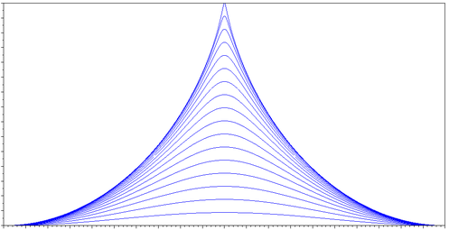 The wave is modeled as a trochoid, as previously mentioned. Because the effects are taken to be as infinitely many points, only the angle of the wave matters (as opposed to its actual height and width, which affect time-dependent behavior). The resulting wave shape is plotted below, each line representing one of 17 amplitude levels: