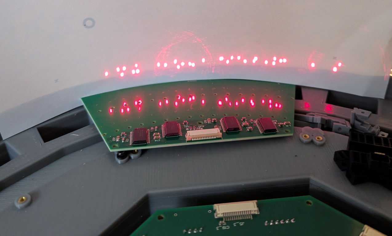 Slow motion capture of scanning through all 256 laser diodes, before alignment and with a cardboard mirror model in center, to test the data communication. A single LD flashes every ms, which is too fast for the camera so multiple LDs appear to be on simultaneously in the frames.