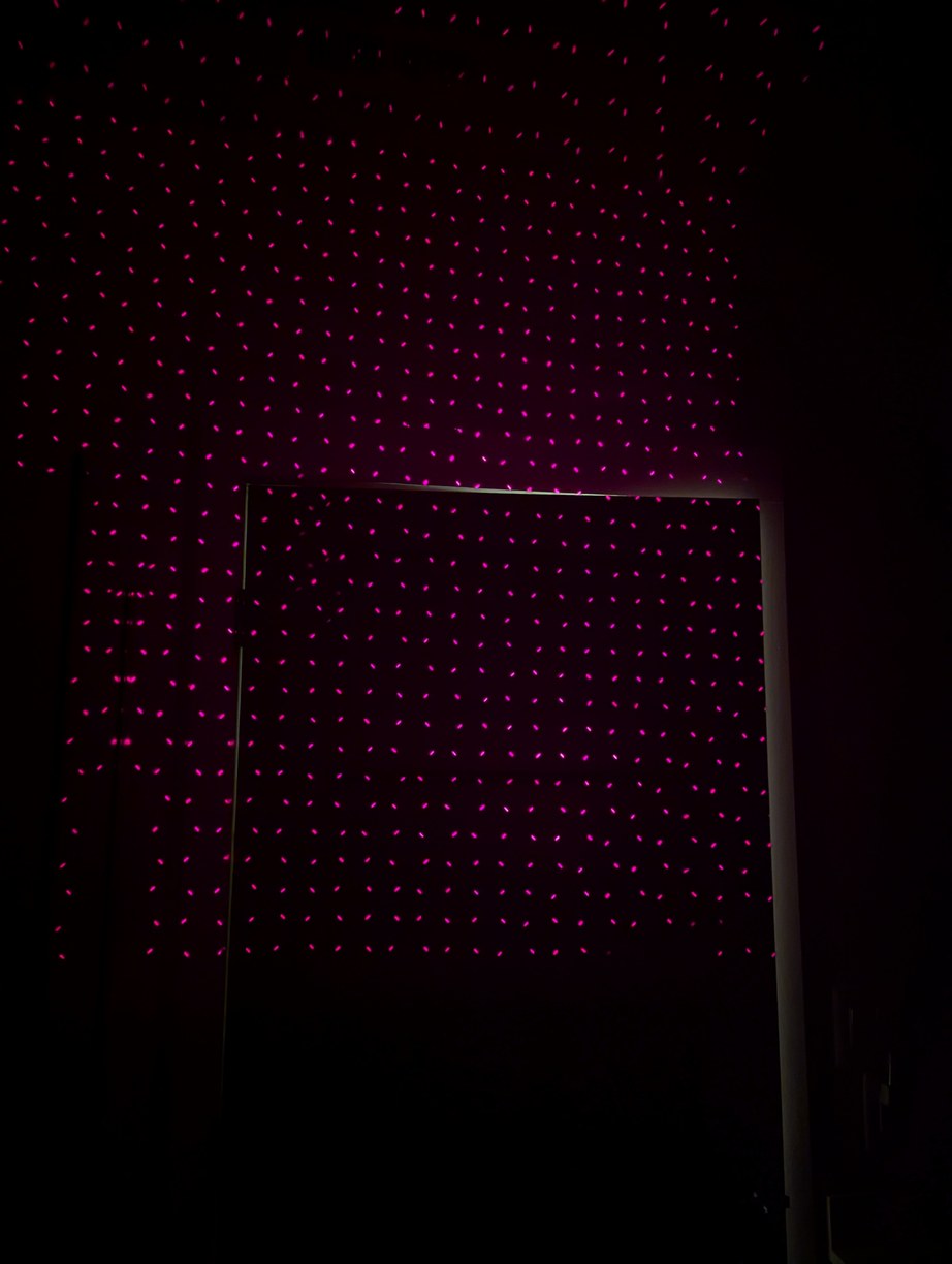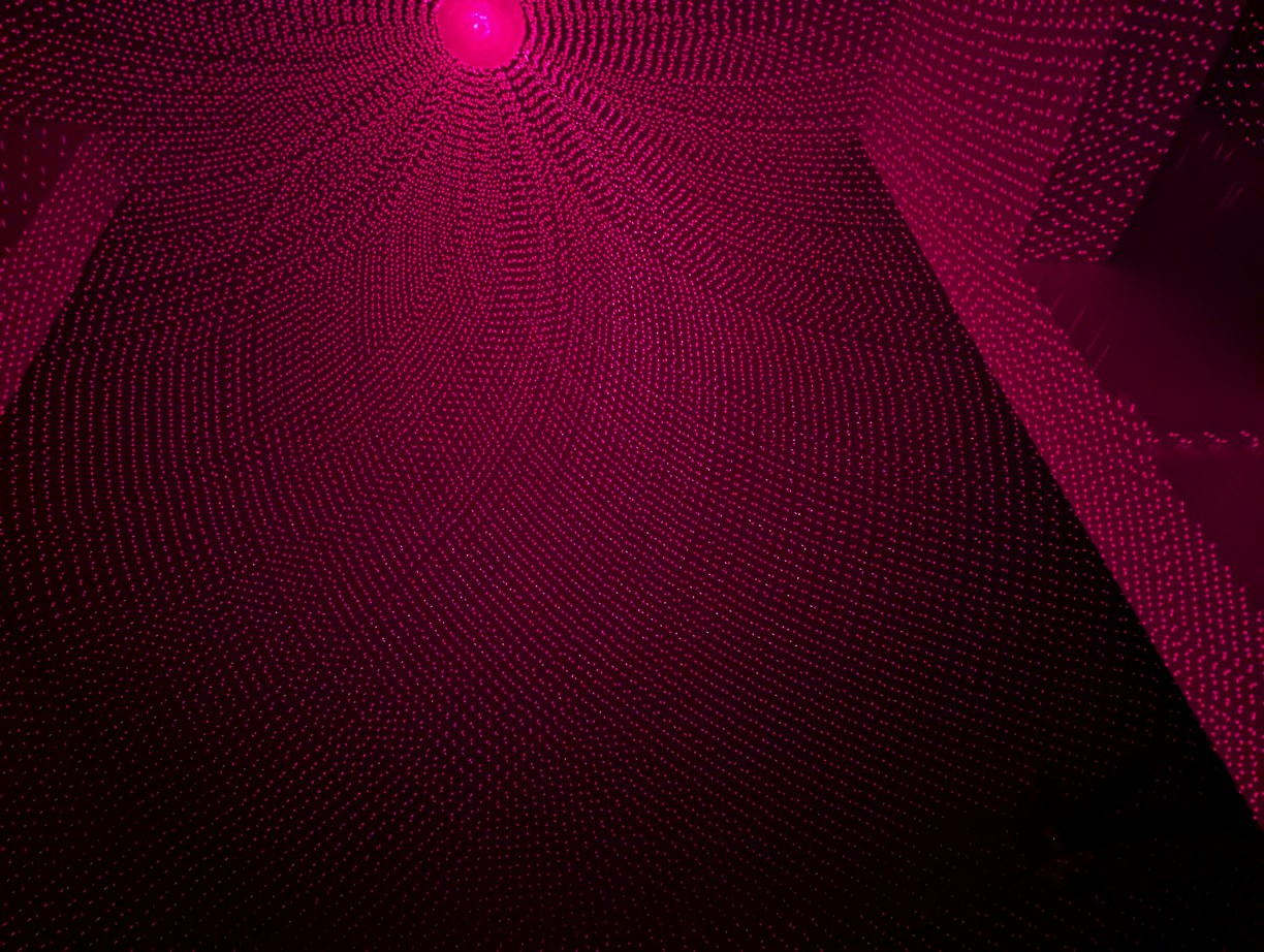 With the same pattern as above, on left, placing the lid (through which the diffused laser beams can be seen) on top of the projector causes the spherical coordinates to be projected onto a plane. On right, without the lid, the laser beams look like they are all emitted from the virtual center point.