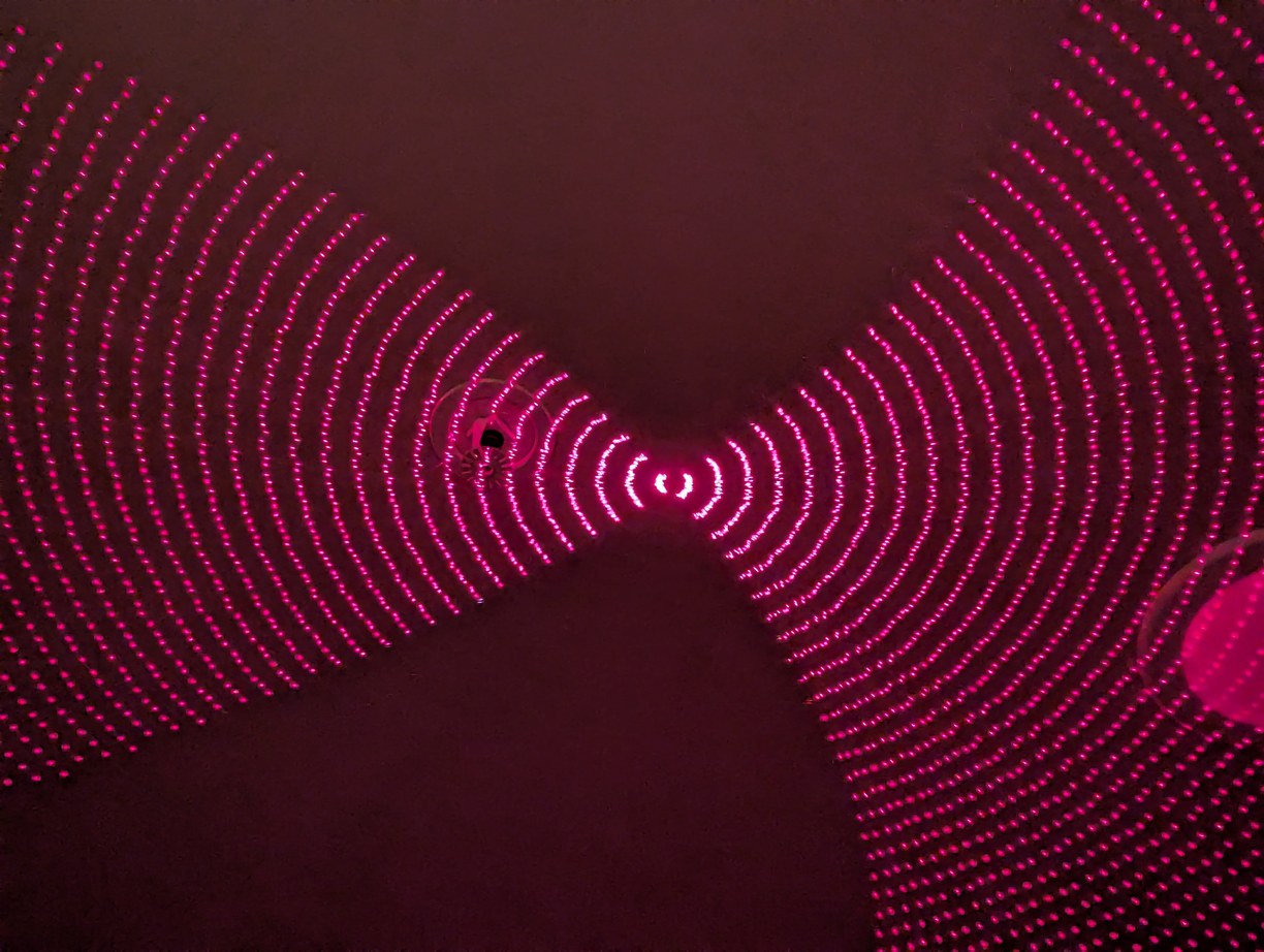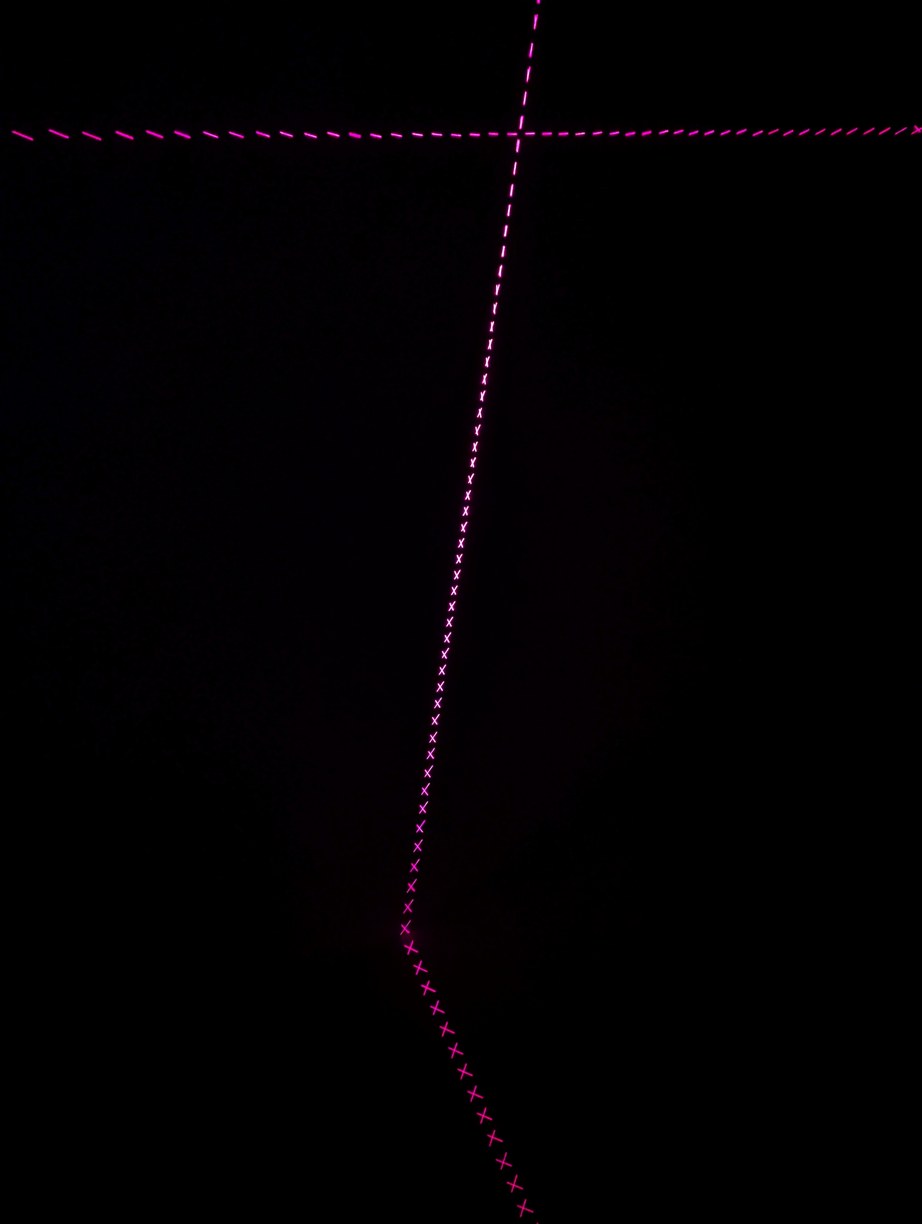 A few more patterns to confirm LD alignment, such as circles which are now more circular than earlier, as well as switching back to the lines of X alignment mode at different phase offsets, creating interesting symmetric images. In the central image, the lower lines are cut off by the top of the projector and represent the lowest projected angle, approximately 2.3 degrees above the horizon.