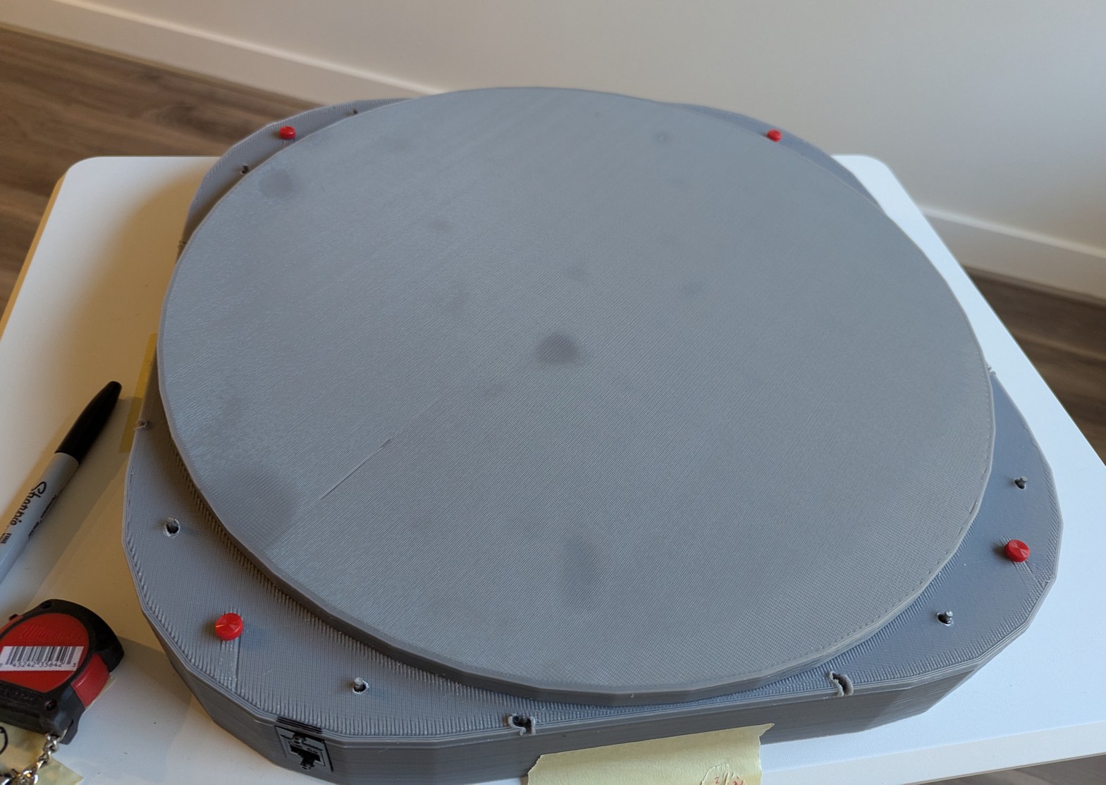 For the next prototype, I made it non-reversible, so all LDs are attached identically, and the adjustment bolts are all under the laser beam path where they can be easily accessed from the top. This required giving up some of the compactness (and not for the last time) by slightly increasing the outer diameter of the projector base from 400 mm to 408 mm. The glue problem, however, felt like a real show-stopper. For a few weeks I was in a bad mood because I could not think of a better solution. Using the hot glue for coarse positioning is really a great approach, because it is easy to align the diode by simply holding it while powered on and putting the beam on a pre-drawn alignment dot. Doing this by other mechanical means would be relatively bulky, expensive, and more complicated to design. However it would be unacceptable to risk LDs coming loose after alignment and ruining the device.