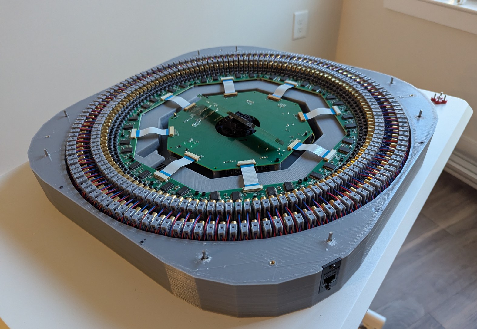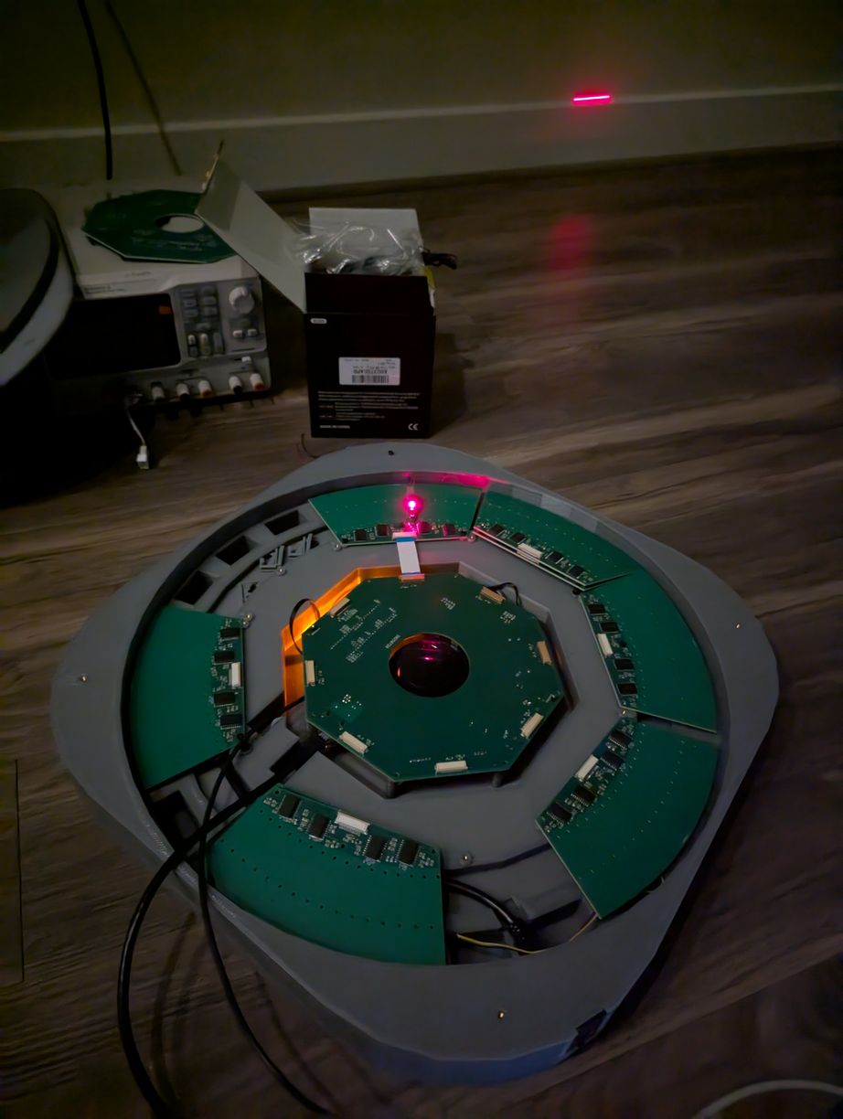 With the lid installed, I could transport this project to different locations for demonstration. Over weeks some LDs moved slightly out of alignment, but this is largely inconsequential for viewing star maps (it would be quite noticeable for viewing bitmap graphics). Initially I planned to use hot glue to secure all LDs after alignment, but I became worried about the risk of the glue somehow making things worse and then being unable to adjust anything without taking apart all the boards; instead I decided to leave everything unglued so that individual LDs that drift out of alignment can be adjusted back with ease. Overall this project has been a marathon - some of the first sketches are from August 2024, and it seems that each part has required multiple iterations - but I am happy to say that the project has met all the original design goals. It is indeed possible, with great patience, to align 256 laser diodes held in 3D printed resin parts, and to synchronize them to a spinning mirror with better than 0.1 degree resolution.
