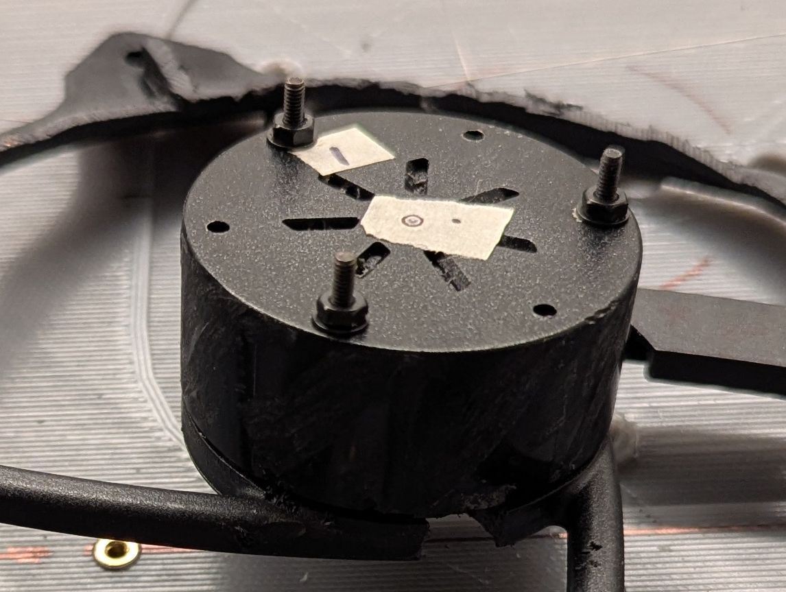 Since the projector base was not originally intended for this motor, it was necessary to insert new melt-in nuts in the correct locations. To find these locations, the motor was centered using thin intersecting wires referenced to PCB attachment points that are intended to be perpendicular.
