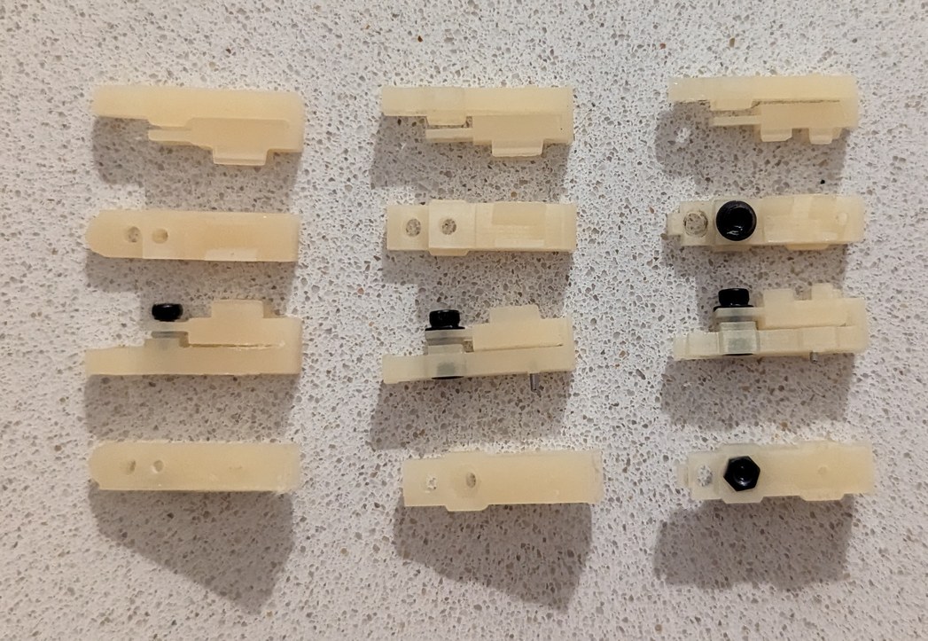 A few more changes were made to the LD Holder 3D print design, to improve performance and reliability. After buying a micro-meter to measure thicknesses, I could verify a reference o-ring compression thickness to within 0.1 mm, and updated the dimensions of the flat surfaces near the o-ring (by about 0.1 mm) so that the laser diode would be level at a reasonable compression level (with enough springiness to push the LD upwards if needed during adjustment, but not so much that the o-ring was deformed and squeezed out through the gaps of the adjustment mechanism), established by feel when tightening the adjustment bolt with a small allen wrench. I was also concerned about the holders deforming over time due to uneven resin curing and shrinkage, so I thought I would lessen this possibility by using a transparent blue resin. However after attempting the print with this new resin, I found that the dimensions weren't quite the same as I had tuned for the previous resin, and the parts warped to a similar extent when left out in the sun for a few days. Thus I switched back to the gray resin, and included holes in the part to allow UV light to better reach internal sections. I tried scaling up to printing over 10 components in one run, which were mostly supports for the outside of the PCBs added as an experimental afterthought, and encountered the challenge of removing the printed pieces from the printer. Because they were so closely packed on the print surface, and so adhered to the metal, I ended up breaking many of the pieces during my attempt to remove them, which caused shattered pieces to fall into the resin underneath (which would then have to be filtered out to avoid breaking the printer on the next print), making the experience very frustrating. I was intending to print 32 pieces per run (it ended up being possible to fit 33 or more) and having to repeat that ordeal for over 8 times to get all the holders printed was out of the question. I did not want to change the holder geometry to improve print separation, because I had already optimized and validated many aspects of the design and did not want to start over again. After briefly considering giving up and sending the design to pcbway for fabrication, I made a substantial improvement in the printed part removal process. The printer came with a metal "putty knife" that I had been using to remove the parts, thinking this must be the optimal choice, which had a thick metal edge that would push the parts instead of separating them from the printing surface, requiring lots of force and often breaking parts. In place of this, I used a thin razor blade scraper (of which I bought a 10-pack on Amazon, and which came in handy for many other tasks), which would easily slide between the printed part and the metal surface, and the part would fall off with almost no force required. I also added diagonal tapers (instead of sharp corners) on the side of the holder contacting the metal, which would give a starting point from which the separation line can propagate. With this approach, printing large batches did not seem so daunting, and I started working towards the required 256 parts.