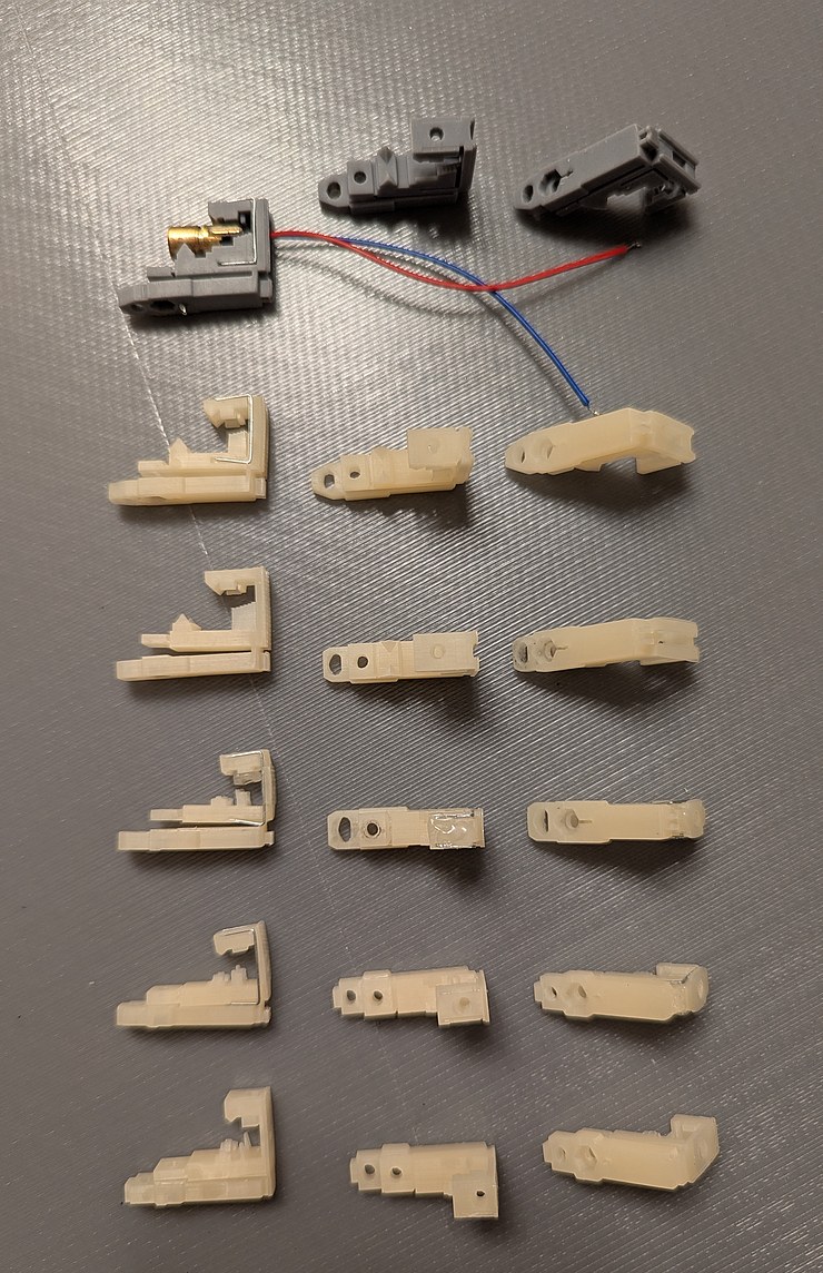 Bottom to top, 6 iterations of holder design for clamped LDs.