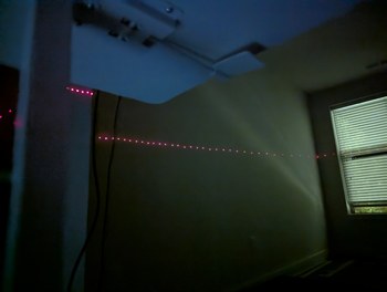 The intersecting LDs reference is hung above the projector, then the mirror is spun up, and the reflection of the lasers onto the device is used to confirm whether the mirror angle is above or below 45 degrees. I used the overhead clothes hanger rod in my closet for this so even more of the apartment is taken up by this project.