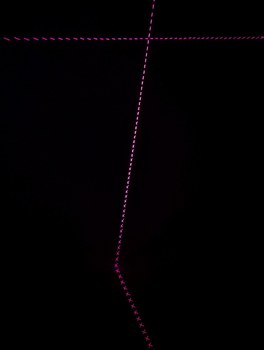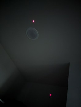 The pixel intersection alignment is similar to the X alignment, but with the lines of the X reduced to dots for higher accuracy. The process is difficult to convey in a photograph as it's just dots on a ceiling, but as an illustration the 4 dots shown here would be overlapped into a single dot by adjusting the corresponding LD holders. When 4 more overlapped dots surround this central one, a correct alignment solution is found.