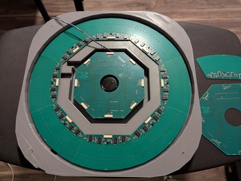 Assembling the LDs and boards. Left, 128 LDs done, with the new encoder ring and motor and accelerometer visible. Right, all 256 LDs done, with the main PCB connected and a cardboard model of the mirror installed on the motor.