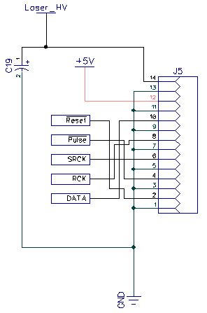 The most flexibility in terms of laser diode control is achieved by shifting out 256 bits in each cycle, however if we need 100 nanosecond timing resolution, the data transfer rates are very high, which has negative impacts for both PCB design and CPU load. Since we are displaying star positions and not very dense images, it is conceivable that a scheme which uses 8 bits to specify a laser number would be more efficient, so at each cycle only 1 laser is powered on, and which laser that is, is specified by the bit code. Then we only need to shift out 8 bits in each cycle, but only 1 laser may be powered on. Alternatively, we may have special codes for on and off (which would set or reset a flip-flop, for example) and then a different laser may be powered on or off at each cycle without disturbing previous ones. These possibilities were simulated using randomly-placed star points to determine when they would not be capable of rendering the scene correctly. The results were discouraging since with as few as 10 stars, the chance of improperly drawing the star (error exceeding the pixel pitch) was approximately 0.5. Thus I was led back to the 256 bit shift, and here the linear nature of the reflected spot position over time really helps the design. Namely, while the pulse timing resolution must be within 100 ns, the data only needs to be shifted out once per mirror position or within 65 us. This means we can use low speed (approx. 1 MHz) data output clock, and a fast hardware timer for the laser output pulse, which is distributed globally only once per cycle (pixel calculation). The data buffer requirements are also reduced, which keeps the CPU load manageable.