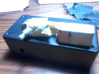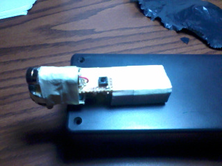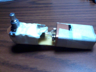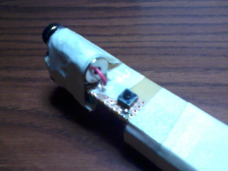 To actually build this, I used a large RadioShack PCB I had lying around, from which I broke off a section at one edge that was five rows into the board, which resulted in a long and relatively narrow board. The width was just enough to attach a 9V battery and the large potentiometer. The circuit, consisting of an LM317, capacitor, diode, and potentiometer, connected to the battery and laser diode, was designed on the PCB in order to minimize space. A trick I found useful was to use components with long leads to double as wire when connections are needed - the leads once soldered can be bent and connected to other components. The button and laser diode were mounted on the metal side of the board, the diode in order to contact a negative voltage point (the assembly is case-grounded, so it is purposefully attached above an exposed row of ground-connected solder points), and the switch in order to be on the opposite side of the 9V battery for easy access.