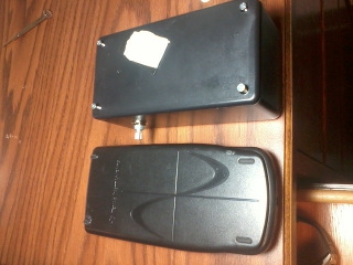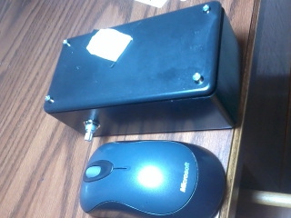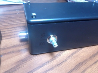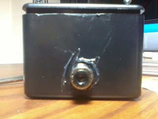 Angle, front, and top views, respectively. At this point the top is not bolted down. The laser output, in the front of the box (head-on view pictured in the middle), is the Aixiz module secured in a drilled hole with some hot glue. On the left of the module, the variable resistor control is accessible, and the case is labeled '50' and '100' so it is easy to tell the current power level. The switch is visible in the top view; I used a pushbutton that was about half as 'tall' as the layer of plastic, so I made an implement that would extend into the hole to press the button; this is the white object pictured on the right side of the top view photo. Doing this provides a level of safety, since most little kids will not be interested enough to find a way to push the power button.
