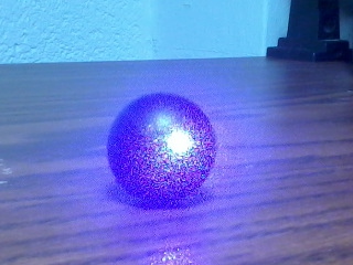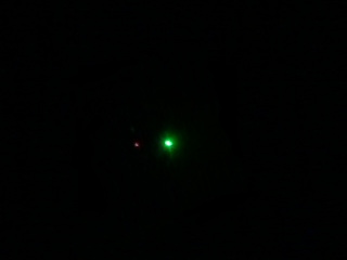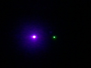 A comparison of brightness between the three lasers I currently own. First photo is violet vs green, second is red vs green (see that little dot to the left of green?). Violet at 100mA, green at an estimated <50mA, and red at about 5mA. The red one is a regular OTC laser pointer, while the green one is supposed to be <5mW but from empirical observations seems to be more. The output power of violet is in the 75-80mW range. Moral of the story: if the only laser you have is a red pointer, you are missing out big-time.