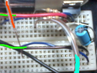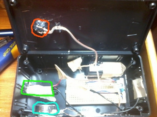 On the left, the inside view of the laser 'box'. On the right, close-up of the driver circuit. The orange outline is the on/off switch, green outline is laser module, and blue outline is variable resistor. The wires are outlined  to match the component they are connected to. The circuit itself is pretty simple, consisting of the two resistors, LM317, diode, and capacitor, all of which are visible in the photo. This is connected through the switch to a 9V battery that is attached to the inside of the box and touching a side of the breadboard.