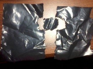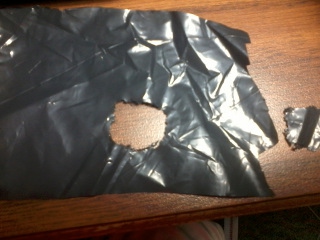 That is me creating an abstract art piece, using the focused laser beam at 100mA, and a piece of plastic cut out of a black leaf/trash bag. The laser certainly can cut through this, but at least at this power it takes a steady hand to make an accurate cut. The material needs to be moved quite slowly, and kept at the proper distance from the lens. Increasing the power output will allow one to move the material faster and thus may provide smoother cuts.