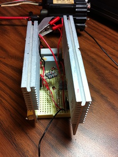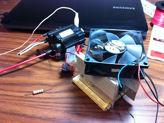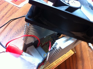 The complete setup with the computer fan added. Perhaps those heatsinks weren't entirely unjustified, since they do heat up under full power! With the fan on, the transformer can be used at 100% duty cycle.