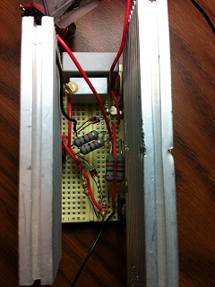 Third, construct the circuit. I did not have a good enclosure for an actual PCB so this one ended up on a breadboard. Below are two views of the breadboard. On the left and right are the two huge heatsinks with one MOSFET mounted to each one of them. Towards the top, the two gray rectangles are the capacitors. I used 2x1KOhm resistors in parallel for 500Ohm total resistance since RadioShack did not have any other resistors that could handle the necessary current. Those are the four large gray resistors in the middle of the breadboard, one pair for each MOSFET. I used two fast diodes in parallel in place of the UF4007s on teravolt's page and they work fine. Instead of using the Zener diodes I hoped for some good luck and it has worked so far. For the inductor on the center-tap I used something that looked approximately like the inductor on teravolt's page, I am guessing 100uH; this also came from the old UPS.