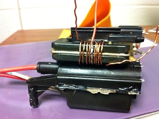 First, wind a primary around the flyback transformer. I used wire from an inductor in a mains line filter from a computer power supply - this wire is thick and has a coating of insulation. There are 5 turns on either side of the center tap to get a higher voltage output.