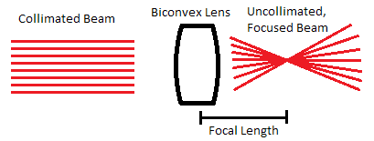 A convex lens focuses the collimated beam, or collimates a focused beam if used in reverse.