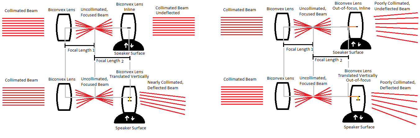 The final breakthrough in this project was due to a mathematical crossover from curved reflectors to convex lenses. Physically, a convex lens acts like a parabolic reflector, bringing the beam to a focus at some focal length outside the lens, except it does not reflect the beam in the process. A second convex lens can be used to re-collimate the beam. If this second convex lens is made to move up and down vertically, the curvature of the lens surface will provide the required angular amplification while the lens itself will serve to almost collimate the laser beam (beam quality getting slightly worse as the deflection increases). What makes this arrangement attractive is the relative ease of obtaining small convex lenses, and the ease of attaching one to a speaker diaphragm (along with its light weight if a small plastic one is used).